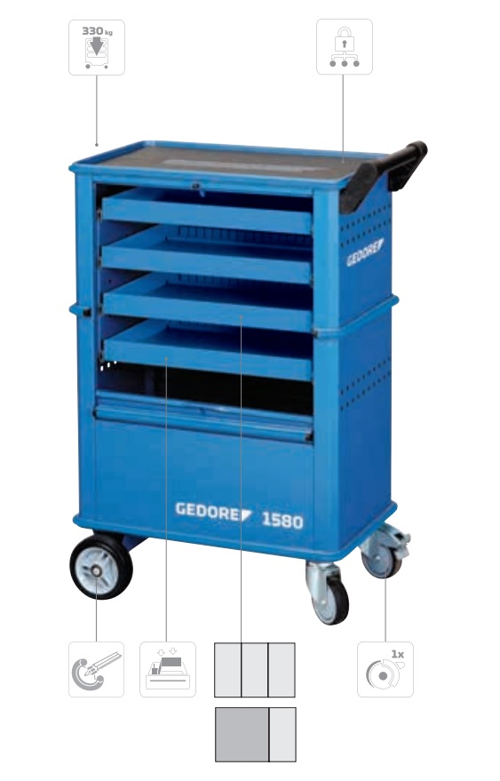 - 2 silindir rulmanlı GEDORE yüksek verim tekerlekleri (sabit tekerlekler 140 mm Ø)